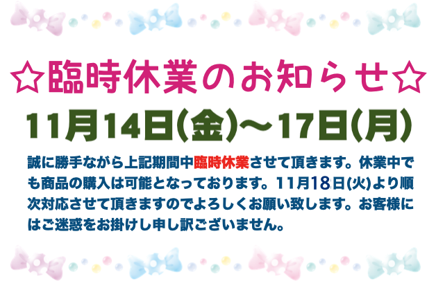●当店は、土日・祝日は休業致します。長期休業・臨時休業はトップページにて告知致します。